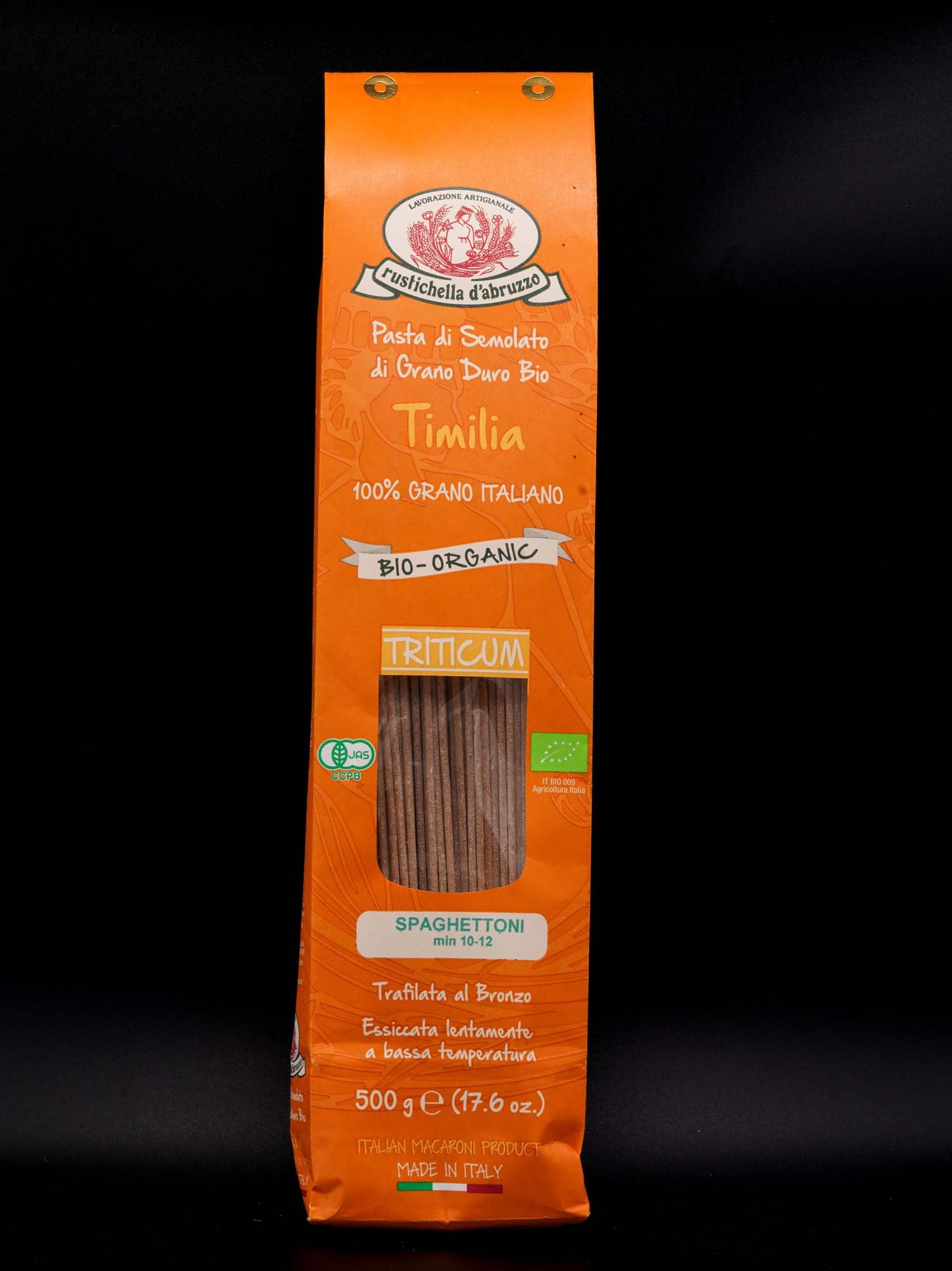 La semola di grano duro Timilia utilizzata nella produzione degli spaghettoni Rustichella d’Abruzzo proviene da coltivazioni di altissima qualità, capaci di valorizzare le caratteristiche organolettiche di questo grano antico. A ciò si aggiunge il processo di trafilatura al bronzo, un metodo che conferisce agli spaghettoni una consistenza porosa e ideale per trattenere i sughi. L’essiccazione lenta e a bassa temperatura completa il ciclo produttivo, mantenendo intatte le proprietà nutritive e il sapore unico della pasta.